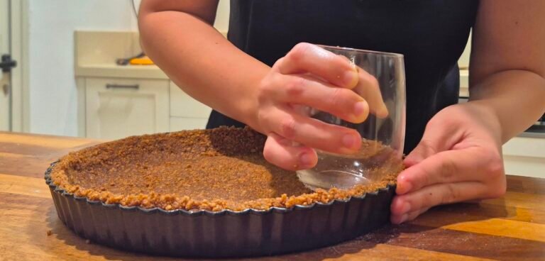 3. דוחסים את התערובת לתבנית טארט בקוטר 23 ס״מ באופן שווה. אופים ב-175 מעלות 10 דקות. מניחים להתקרר לגמרי.