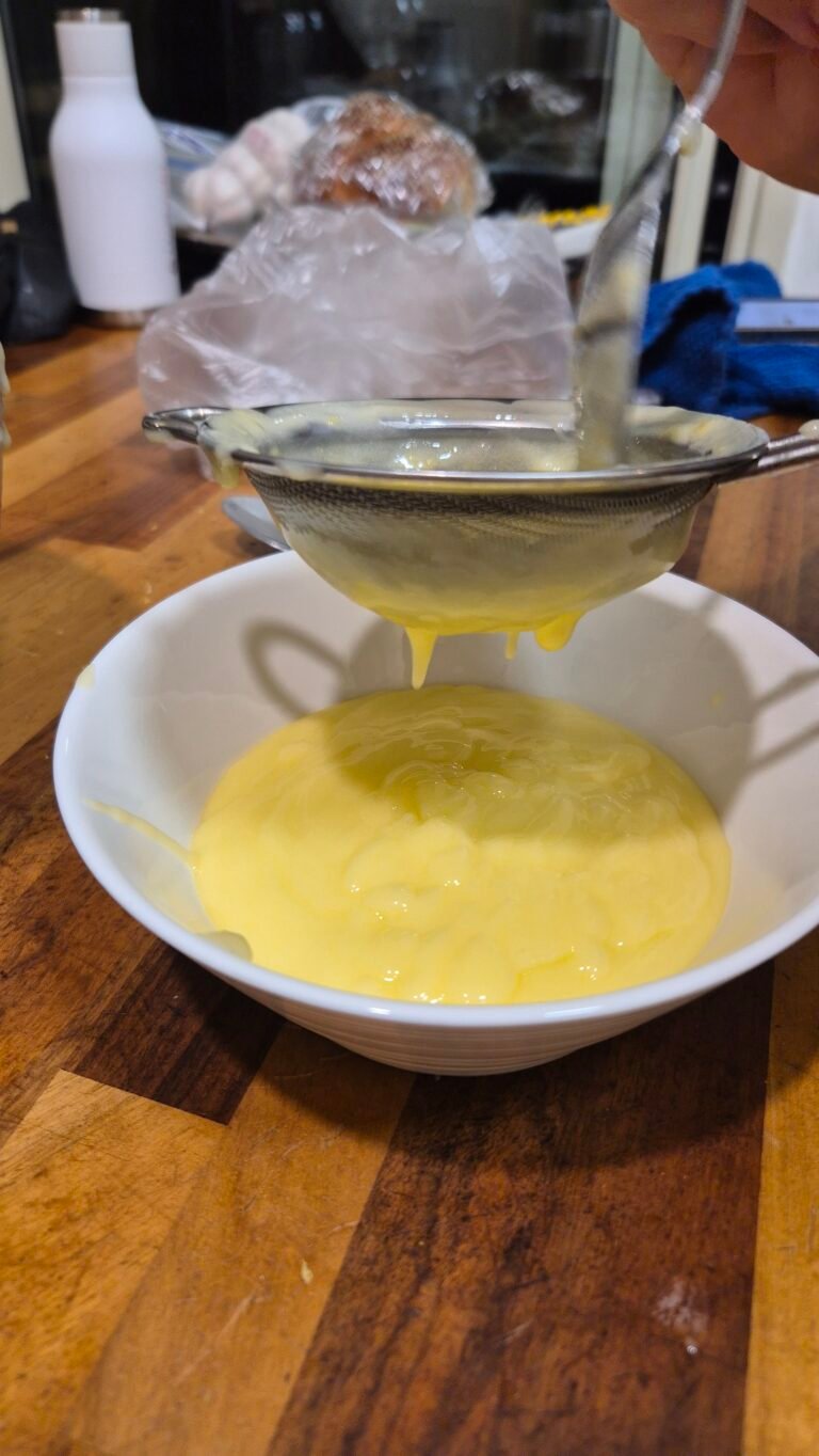 1. מערבבים בסיר מיץ לימון וסוכר. מוסיפים ביצים ומבשלים על אש נמוכה תוך טריפה מתמדת עד להסמכת הקרם — בערך כמו מרקם של דני.