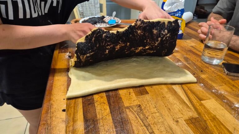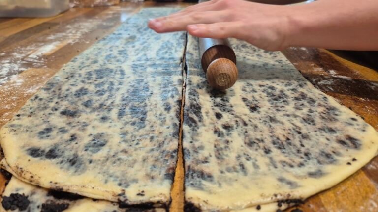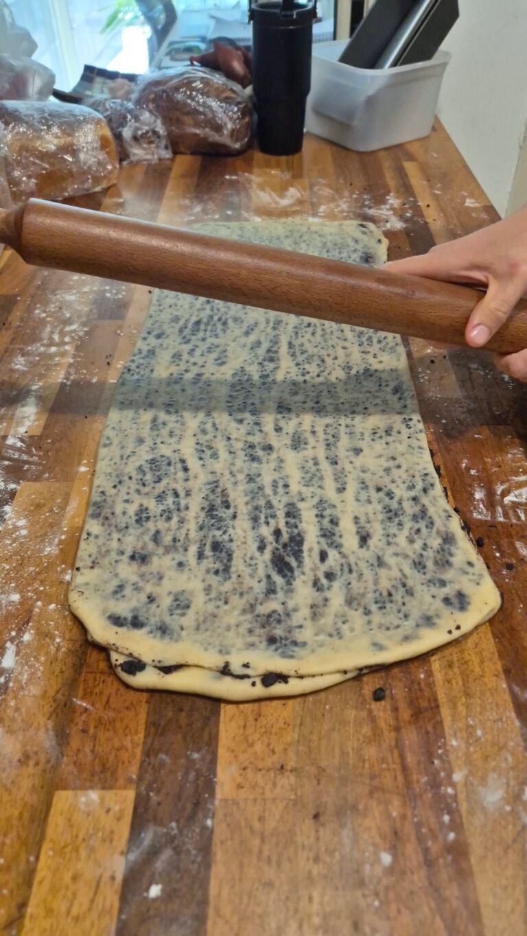 מרדדים את הבצק בלחיצות למלבן מאורך בעובי של כ 3 מילימטר כך שרואים את המלית.